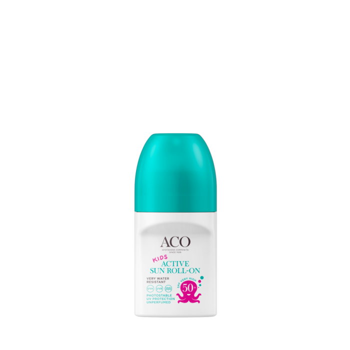 Erityisesti lapsille kehitetty aurinkovoide kätevässä roll-on pakkauksessa. Sen edistykselliset laajakirjoiset ja fotostabiilit UV-filterit suojaavat auringon UVA- ja UVB-säteiltä. Voidetta voidaan levittää myös märälle iholle ja se on veden- ja hiekankestävä. Ei sisällä alkoholia, eikä väriaineista. Sopii herkälle iholle. Dermatologisesti testattu. Erittäin korkea suoja (SPF 50+). Sisältää kemiallisen UV-suojan ja fysikaalisen partikkelisuojan. Sisältää ACO Triple Moist Complex-kosteudensitojayhdisteen, joka syväkosteuttaa ihoa tehokkaasti, välittömästi ja pitkävaikutteisesti. Erittäin veden- ja hiekankestävä. Sopii herkälle iholle. Dermatologisesti testattu.