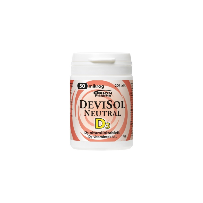 Sväljbar D3-vitamintablett. Utan aromämnen och sockerfri. Den lilla tabletten är lätt att svälja. Innehåller varken sötningsmedel eller aromämnen. DeviSol Neutral -tabletten innehåller vitamin D3 som absorberas väl.