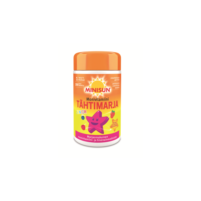Minisun monivitamiinit ovat helppo tapa turvata vitamiinien ja hivenaineiden saanti ympäri vuoden. Minisun Monivitamiini Junior Tähtimarja on suomalaisille lapsille suunniteltu monivitamiinivalmiste. Se sisältää D-vitamiinia, C-vitamiinia ja sinkkiä. D-vitamiiini edistää immuunijärjestelmän normaalia toimintaa lapsilla. Minisun Monivitamiini Junior Tähtimarja on pienikokoinen, tähden muotoinen purutabletti, joka maistuu lempeän marjaiselle. Pieni purutabletti on helppo imeskellä, pureskella tai niellä. Tuote on laktoositon, gluteeniton, maidoton, soijaton, liivatteeton ja hiivaton.