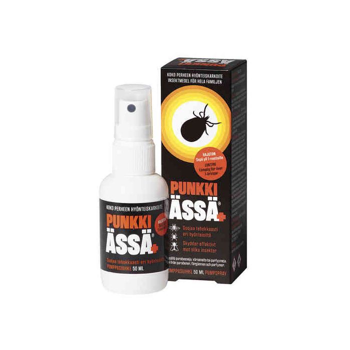 Hajusteeton valmiste punkkien, hyttysten ja hyönteisten karkottamiseen. Soveltuu yli 1-vuotiaille. Valmiste ei sisällä väriaineita, parabeeneja eikä hajusteita.