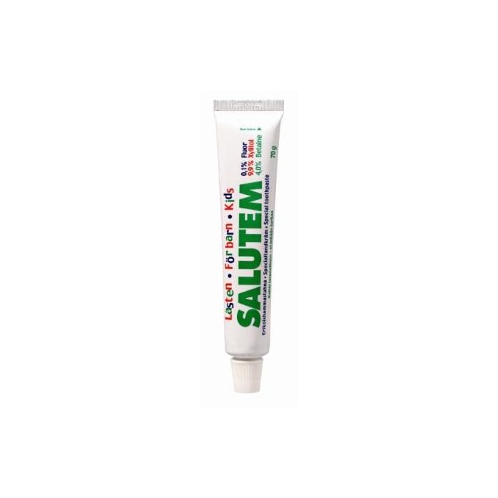 Salutem för barn är avsedd för barn 1 ½ - 6 år och för andra personer med känslig mun. Innehåller inga irriterande ämnen. Utan smakämnen, färgämnen eller natriumlaurylsulfat. Förteckning över ingredienser: Ingredienser: Xylitol 9,9 %, Betain 4,0 %, Fluorid 0,1 %. Aqua, Crystalline Sorbitol, Hydrated Silica, Crystalline Xylitol, PEG, Anhydrous Natural Betaine, Cellulose Gum, Sodium Fluoride (0,10%), Sorbate